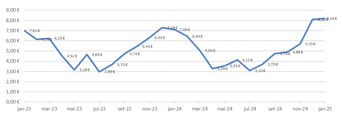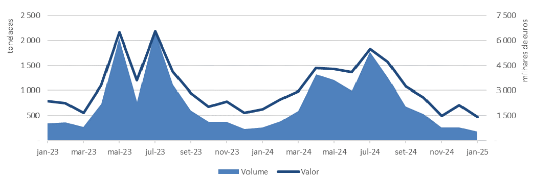 Quanto ao preço médio, neste mês aumentou 15,5% face ao mesmo mês do ano passado, para 8,19 €/kg,