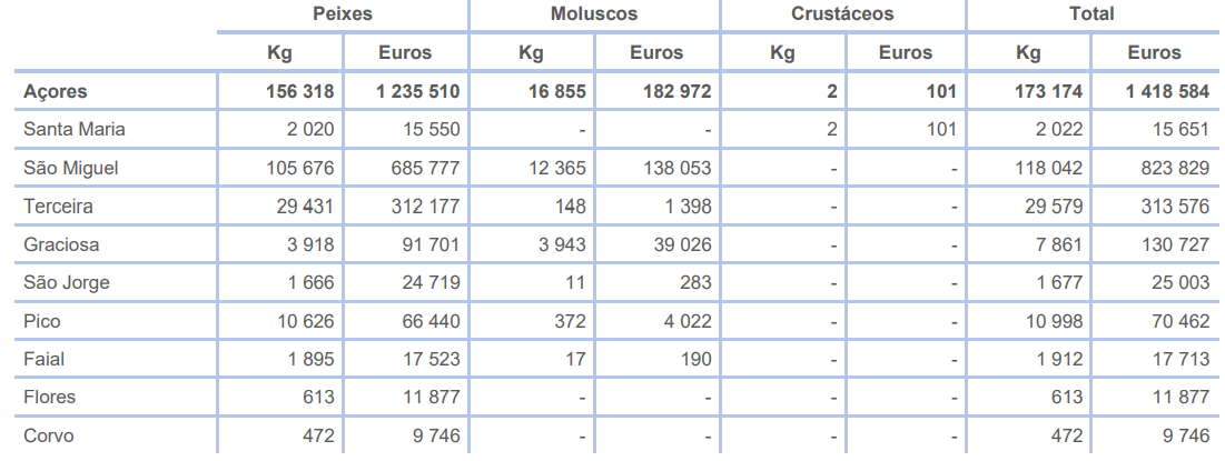 Mais de metade das descargas foram efetuadas na ilha de São Miguel (68,2%) e 58,1% do valor total das vendas foi gerado nesta ilha. A ilha do Corvo apresentou o preço médio mais elevado (20,63 €/kg), valor consideravelmente superior à média regional (8,19 €/kg).