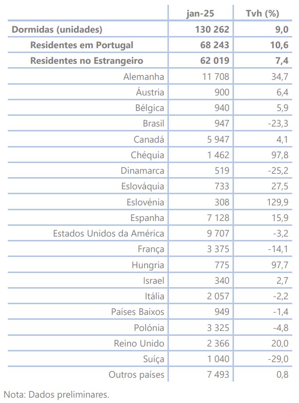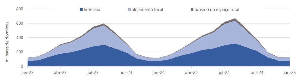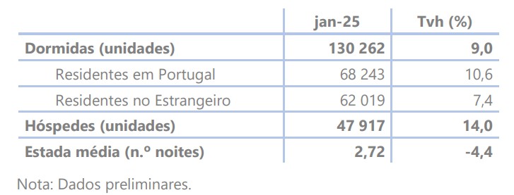 Entre janeiro de 2023 e janeiro de 2025, no conjunto dos estabelecimentos de alojamento turístico, o