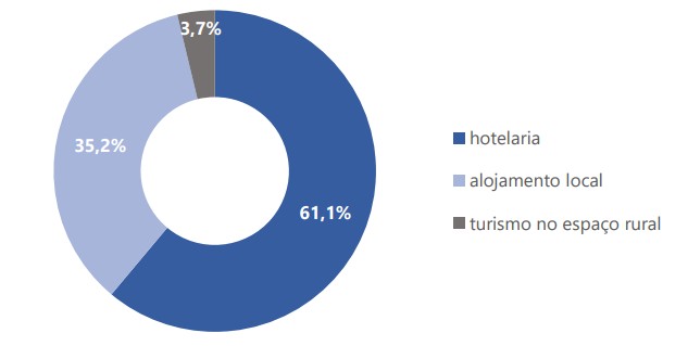Considerando o conjunto dos estabelecimentos de alojamento turístico, a hotelaria concentrou 61,1% da totalidade de dormidas (79,6 mil dormidas), seguindo-se o alojamento local com 35,2% (45,8 mil dormidas) e o turismo no espaço rural com 3,7% (4,9 mil dormidas).
