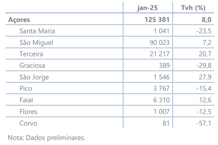 No alojamento local, em janeiro, as ilhas que apresentaram variação homóloga positiva nas dormidas foram: São Jorge (112,3%), Graciosa (81,3%), Terceira (14,7%), Santa Maria (8,3%) e São Miguel (6,5%). Em sentido inverso, as ilhas Corvo (-100,0%), Pico (-30,2%), Faial (-14,5%) e Flores (-8,4%).