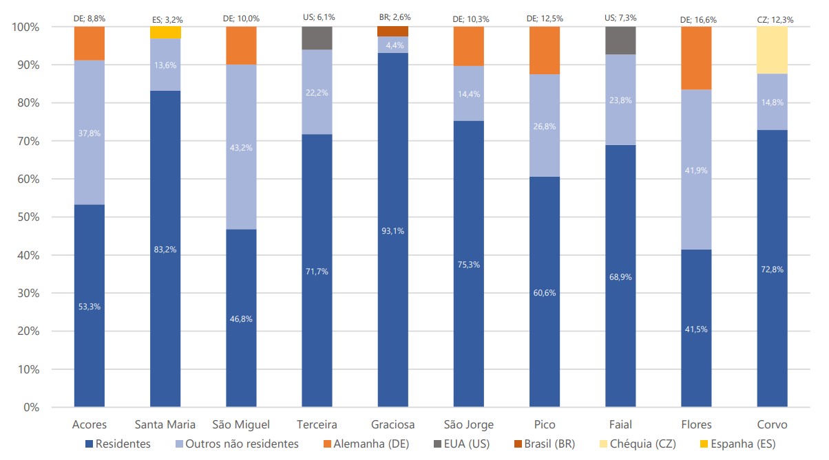 Analisando as dormidas, por mercados (residentes em Portugal e não residentes), na hotelaria e alojamento local, para os Açores, o mercado nacional garantiu 53,3% do total, enquanto os mercados externos contribuíram com 46,7%. Em todas as ilhas dos Açores, com exceção de São Miguel e Flores, o mercado nacional teve um maior peso nas dormidas sendo mais expressivo nas ilhas Graciosa (93,1%), Santa Maria (83,2%) e São Jorge (75,3%).