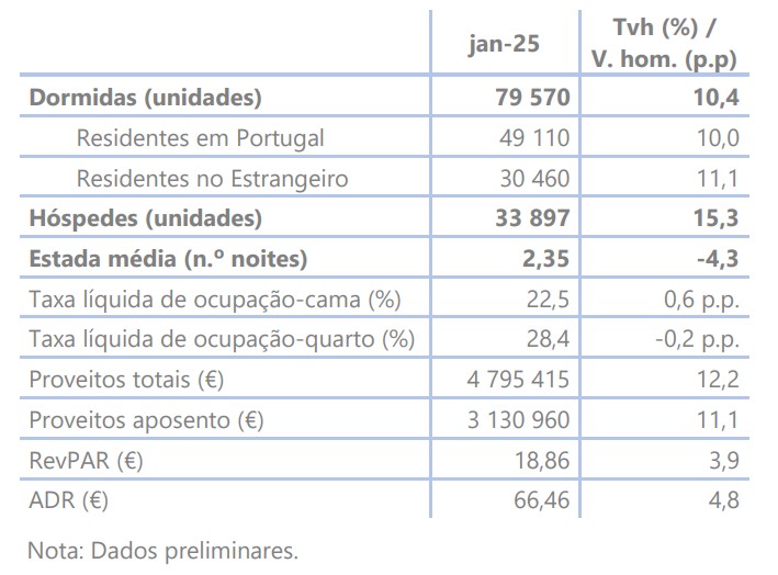 Os proveitos totais, no mês de janeiro, registaram uma variação homóloga positiva de 12,2%, atingindo 4,8 milhões de euros, e os proveitos de aposento tiveram uma variação positiva de 11,1% relativamente ao mesmo mês do ano anterior, totalizando 3,1 milhões de euros. O rendimento médio por quarto disponível (RevPAR) foi de 18,86 euros e por quarto utilizado (ADR) foi de 66,46 euros.