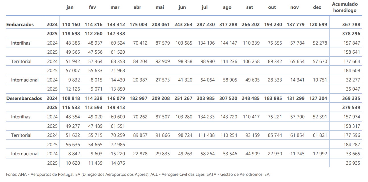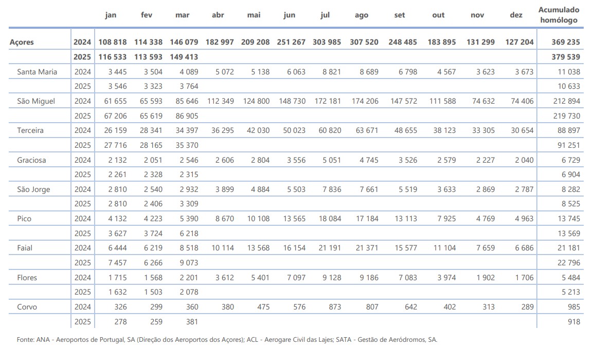 No mês de março de 2025 desembarcaram nos aeroportos dos Açores 149 413 passageiros (tvh¹: +2,3%). Os passageiros desembarcados com origem noutras regiões do território nacional atingiram os 72 986, interilhas 61 551 e internacionais 14 876.