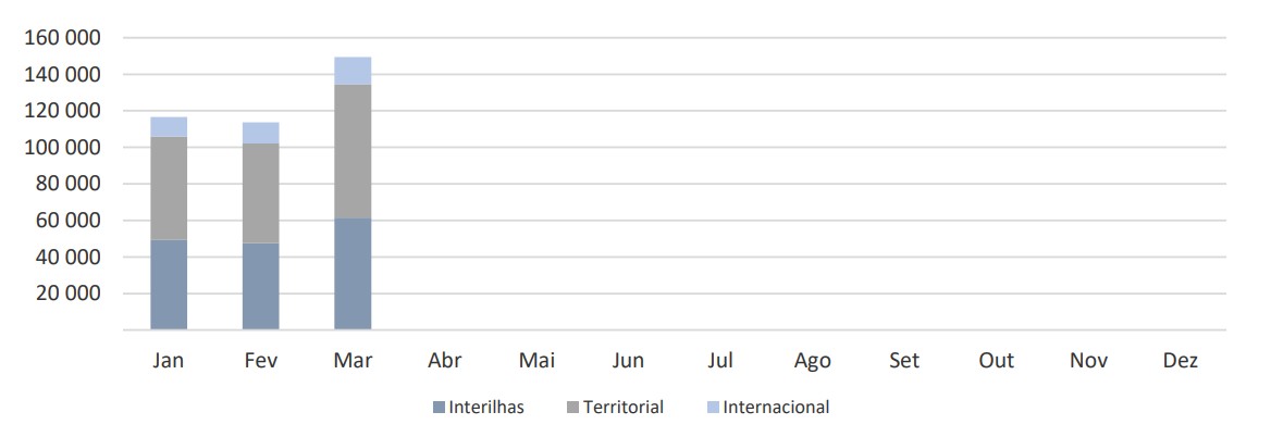 Relativamente à tipologia de voo, verificou-se uma variação homóloga positiva de 5,3% dos passageiros embarcados nos voos territoriais e de 1,6% nos voos interilhas. Em sentido contrário, verificou-se variação homóloga negativa de 4,0% nos voos internacionais.
