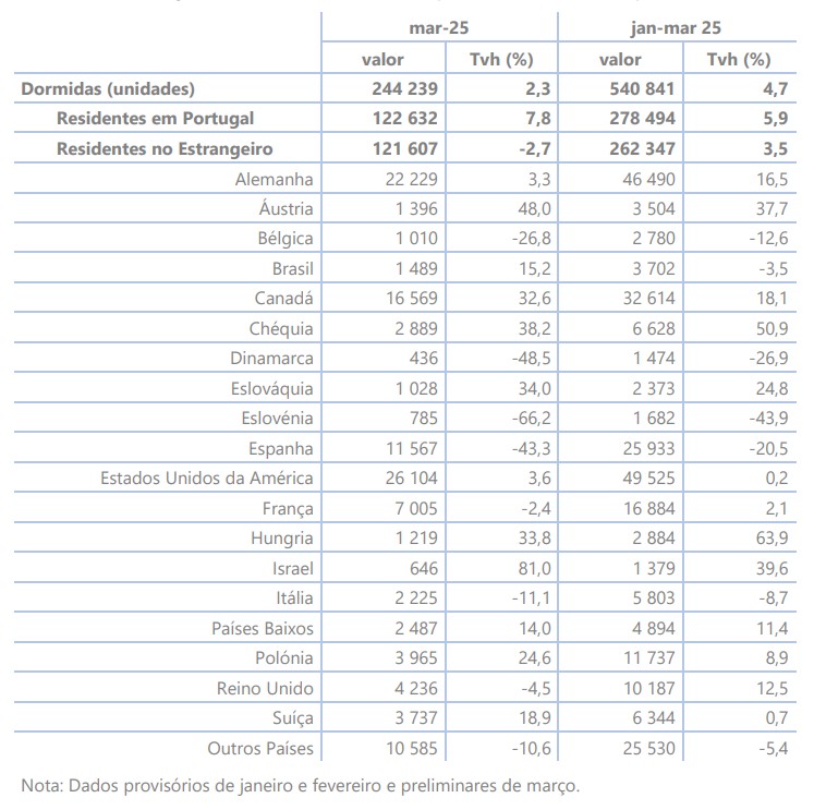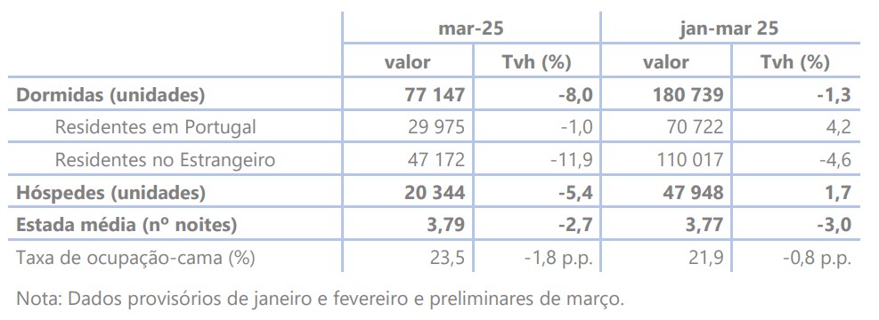 No país, em março, as dormidas na hotelaria apresentaram uma variação homóloga negativa de 2,5%.