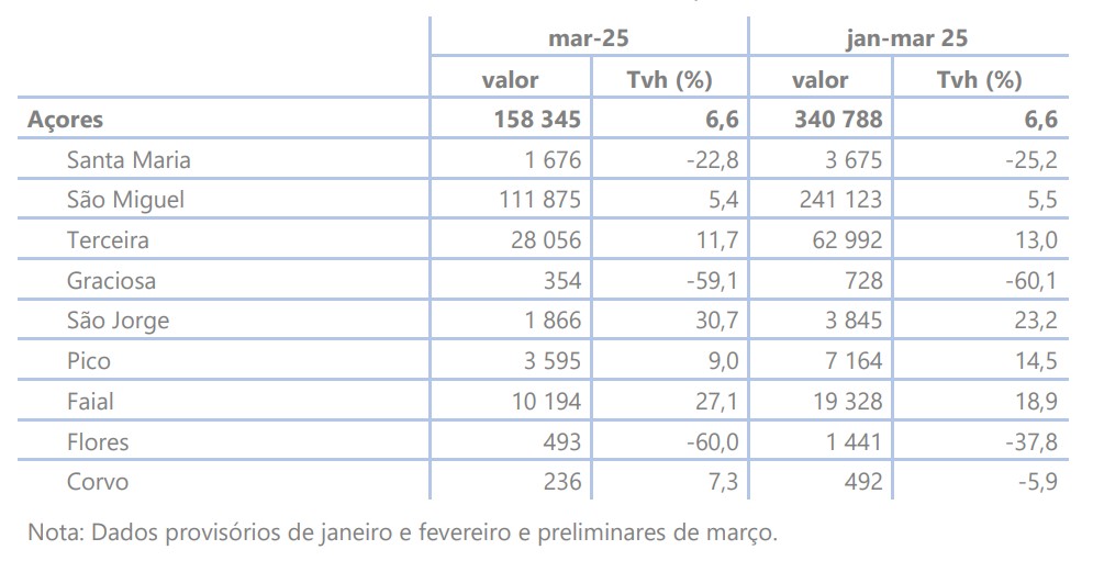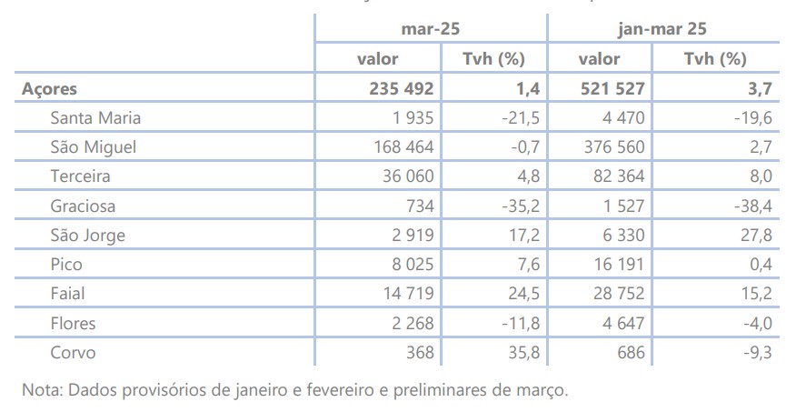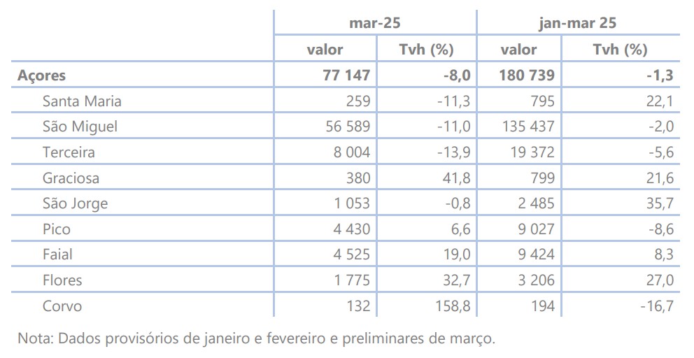 Na hotelaria, em março, as ilhas que apresentaram variação homóloga positiva nas dormidas foram: São Jorge (30,7%), Faial (27,1%), Terceira (11,7%), Pico (9,0%), Corvo (7,3%) e São Miguel (5,4%). Em sentido inverso, as ilhas Flores (-60,0%), Graciosa (-59,1%) e Santa Maria (-22,8%) apresentaram variação homóloga negativa nas dormidas.