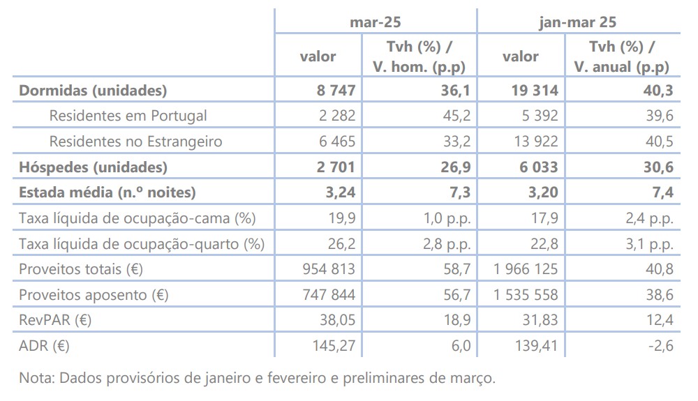 Os proveitos totais, no mês de março, registaram uma variação homóloga positiva de 58,7%, atingindo 954,8 mil euros, e os proveitos de aposento tiveram uma variação positiva de 56,7% relativamente ao mesmo mês do ano anterior, totalizando 747,8 mil euros. O rendimento médio por quarto disponível (RevPAR) foi de 38,05 euros e por quarto utilizado (ADR) foi de 145,27 euros.