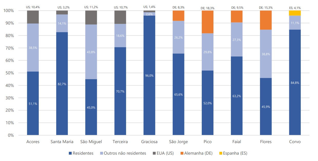 Analisando as dormidas, por mercados (residentes em Portugal e não residentes), na hotelaria e alojamento local, para os Açores, o mercado nacional garantiu 51,1% do total, enquanto os mercados externos contribuíram com 48,9%. Em todas as ilhas dos Açores, com exceção de São Miguel e Flores, o mercado nacional teve um maior peso nas dormidas, sendo mais expressivo nas ilhas Graciosa (96,0%), Corvo (84,8%) e Santa Maria (82,7%). Analisando os principais mercados externos, o mercado norte americano foi o principal mercado externo para os Açores (10,4%) e nas ilhas São Miguel (11,2%), Terceira (10,7%), Santa Maria (3,2%) e Graciosa (1,4%). Nas ilhas Pico (18,3%), Flores (15,3%), Faial (9,5%) e São Jorge (8,3%) a Alemanha foi o principal mercado externo e no Corvo foi a Espanha (4,1%).