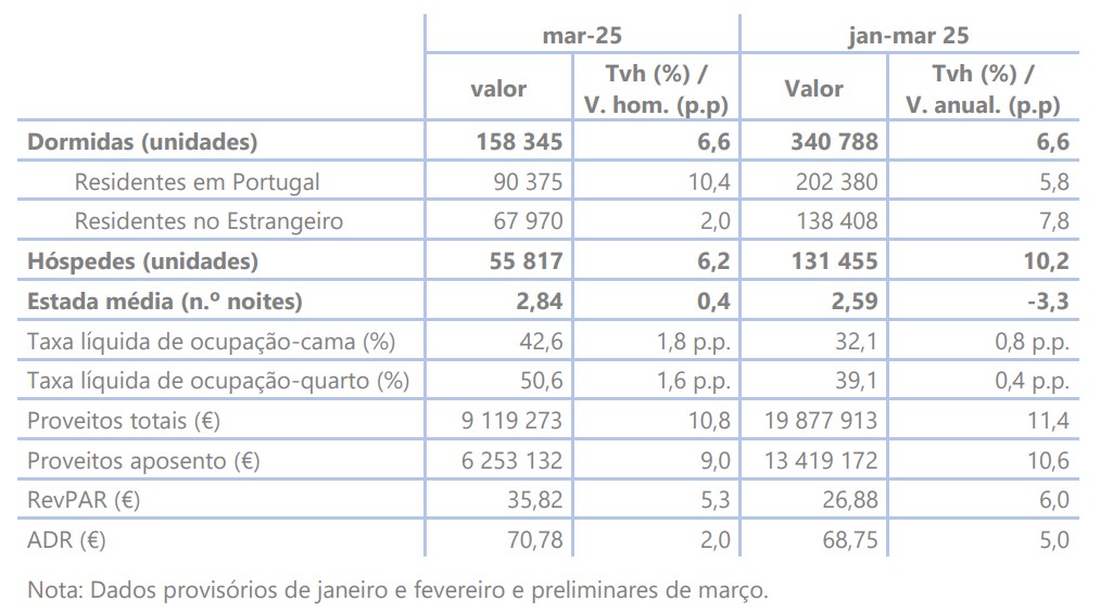 Os proveitos totais, no mês de março, registaram uma variação homóloga positiva de 10,8%, atingindo 9,1 milhões de euros, e os proveitos de aposento tiveram uma variação positiva de 9,0%, relativamente ao mesmo mês do ano anterior, totalizando 6,3 milhões de euros. O rendimento médio por quarto disponível (RevPAR) foi de 35,82 euros e por quarto utilizado (ADR) foi de 70,78 euros.
