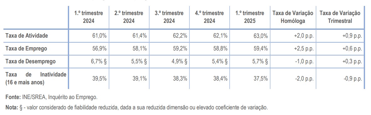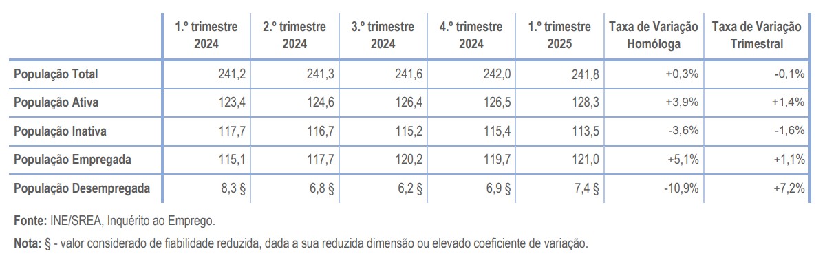 A população empregada (121,0 milhares de indivíduos) aumentou 5,1% face ao trimestre homólogo e 1,1% relativamente ao 4.º trimestre de 2024. A população desempregada (7,4 milhares de indivíduos) diminuiu face ao trimestre homólogo (-10,9%) e aumentou relativamente ao trimestre anterior (+7,2%).