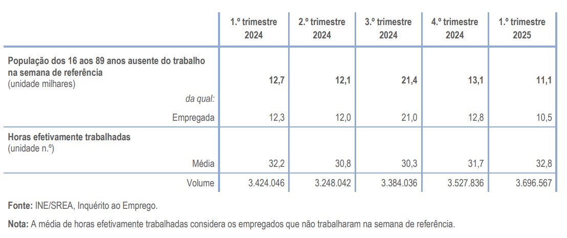 No primeiro trimestre de 2025 estiveram ausentes do trabalho na semana de referência 11,1 milhares de indivíduos dos 16 aos 89 anos. Neste trimestre, o volume de horas efetivamente trabalhadas foi de 3.696.567.