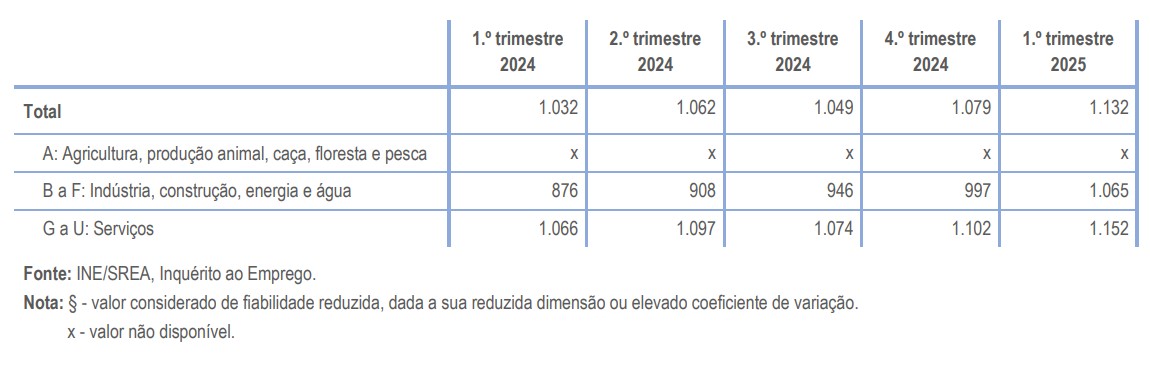 O setor dos Serviços foi o que apresentou o rendimento salarial médio mensal líquido dos trabalhadores por conta de outrem mais elevado (1.152 euros), apresentando uma variação homóloga de +8,1%.