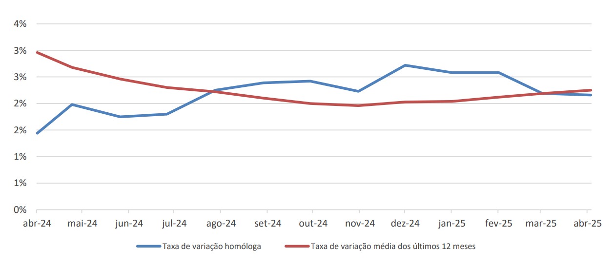 A taxa de variação média dos últimos doze meses, terminados em abril, do Índice de Preços no Consumidor, “Total”, subiu para 2,25%. As maiores variações médias positivas verificaram-se nas classes “Restaurantes e hotéis” (5,46%), “Saúde” (4,21%), “Habitação, água, eletricidade, gás e outros combustíveis” (4,05%), “Comunicações” (4,04%) e “Bebidas alcoólicas e tabaco” (4,01%). Em sentido contrário, a classe que apresentou maior variação média negativa foi a do “Vestuário e calçado” (-2,80%).