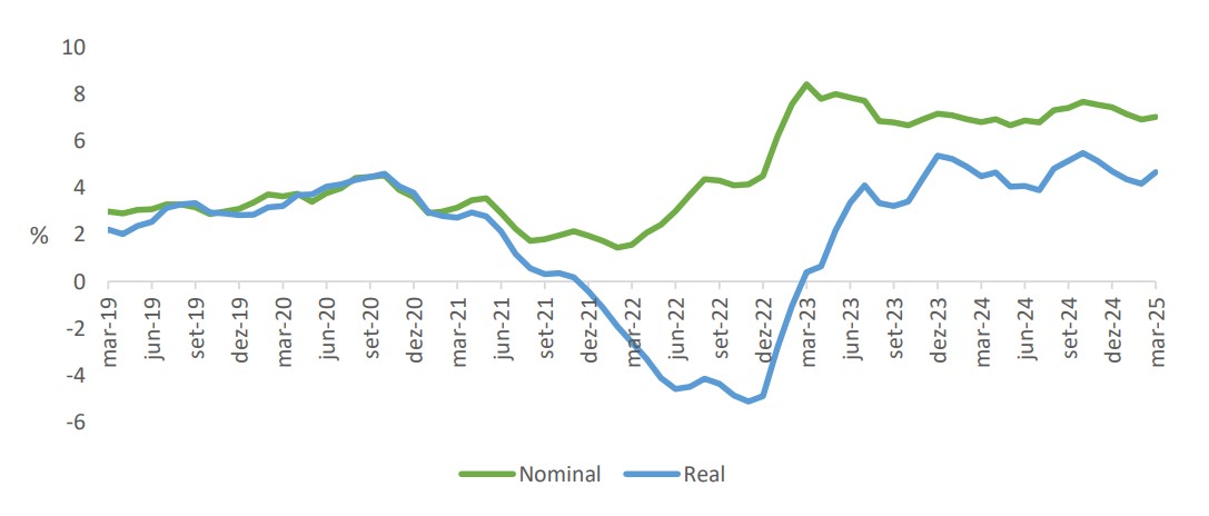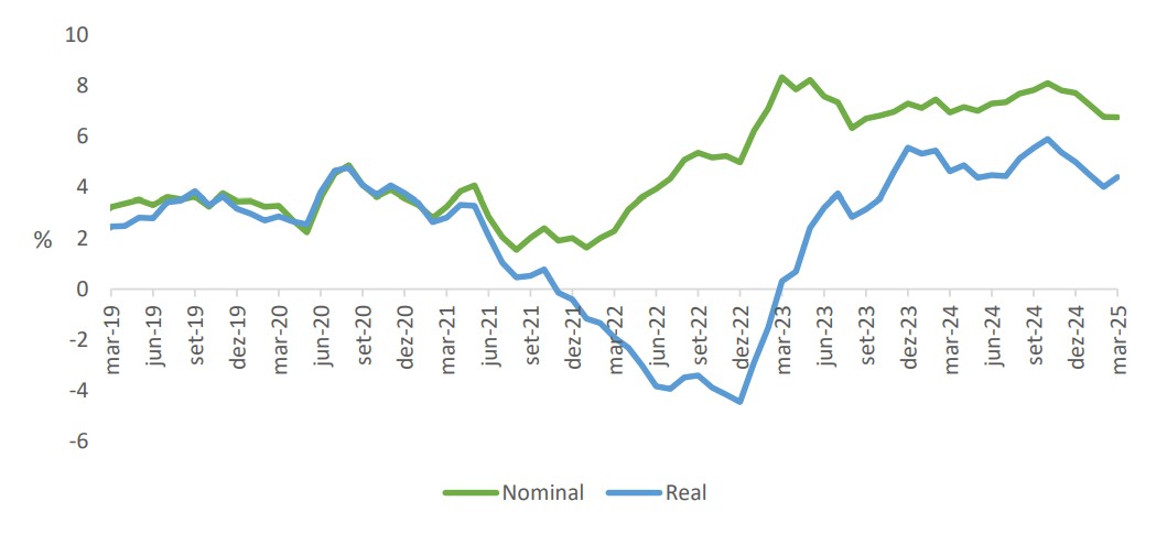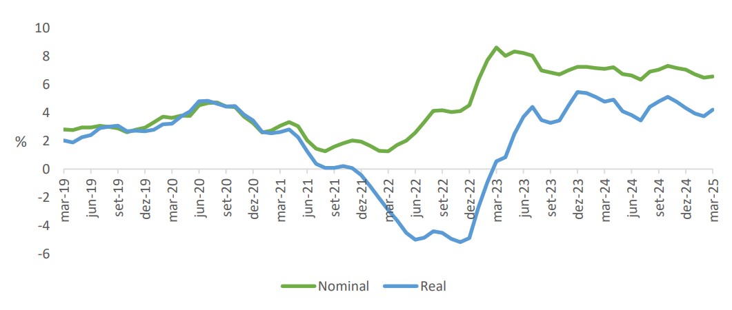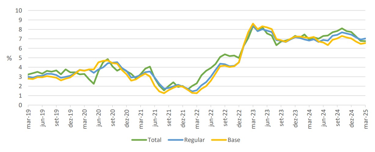 Descontando a inflação, medida pelo Índice de Preços no Consumidor (IPC)2 , que foi 123,217 em março de 2025 (para Portugal), as remunerações analisadas (total, regular e base) registaram variações homólogas reais de 4,4%, a total, 4,7%, a regular, e 4,2%, a base (Figura 2, Figura 3 e Figura 4).