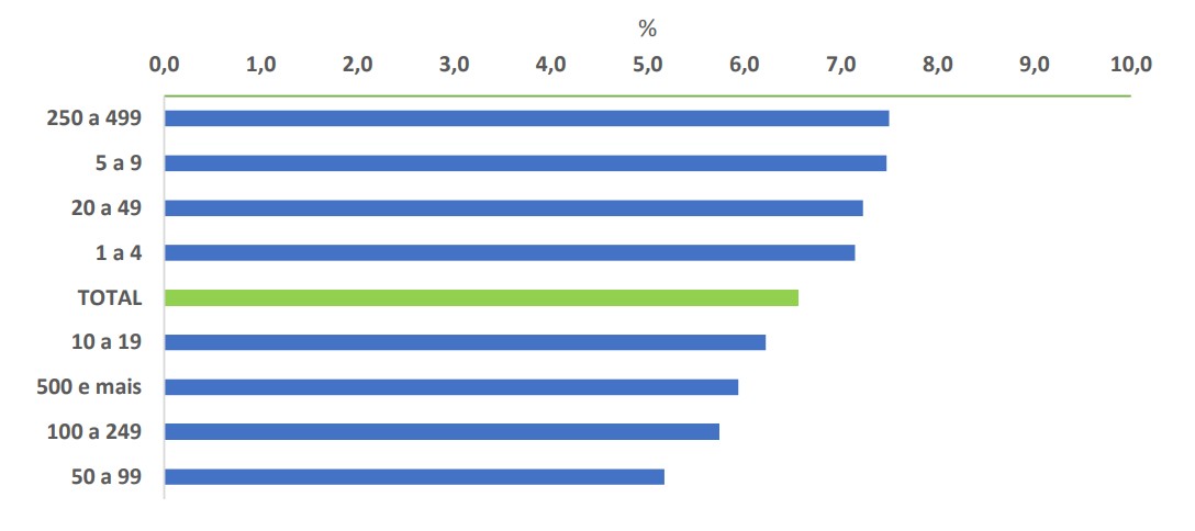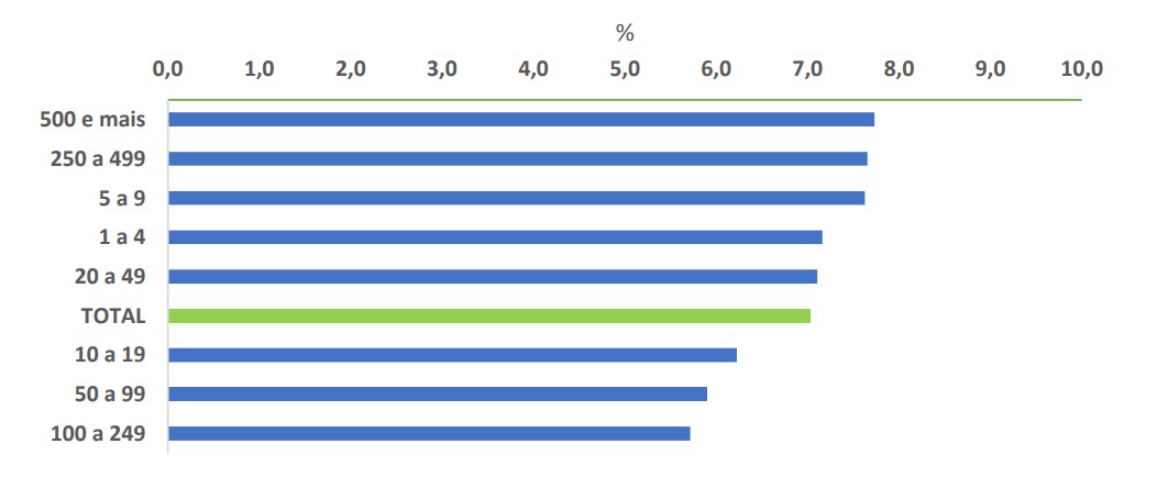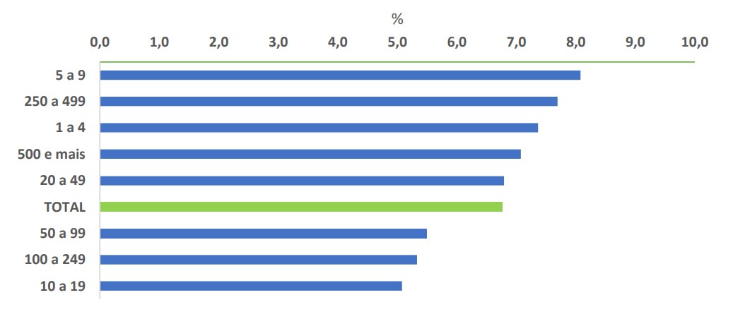 Em termos de remuneração bruta regular, os valores auferidos variaram igualmente entre 909 euros nas entidades com 1 a 4 trabalhadores e 1.733 euros nas entidades com 500 e mais trabalhadores (Figura 9 e Quadro 3); as maiores variações homólogas verificaram-se nas entidades com 250 a 499 trabalhadores e 500 e mais trabalhadores (+7,7%).
