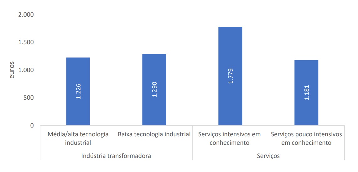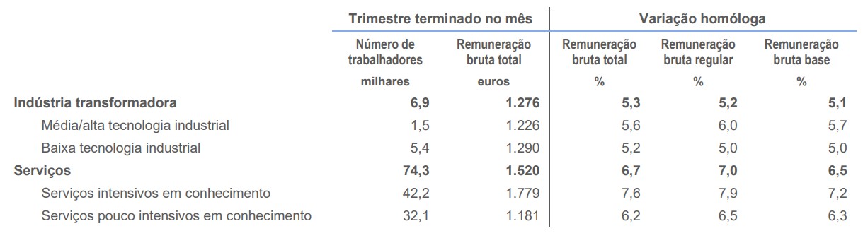 No mesmo mês, a remuneração bruta total média por trabalhador nos Serviços Intensivos em Conhecimento registou um valor da remuneração bruta total média de 1.779 euros, o que representa um aumento homólogo de 7,6%. Para os Serviços Pouco Intensivos em Conhecimento, a remuneração bruta total foi de 1.181 euros, com um aumento homólogo de 6,2%. No conjunto dos Serviços, o valor da remuneração bruta total média, por trabalhador, foi de 1.520 euros (uma variação homóloga positiva de 6,7%) (Figura 12 e Quadro 4).
