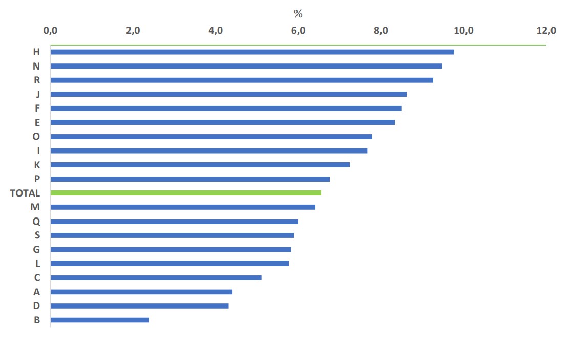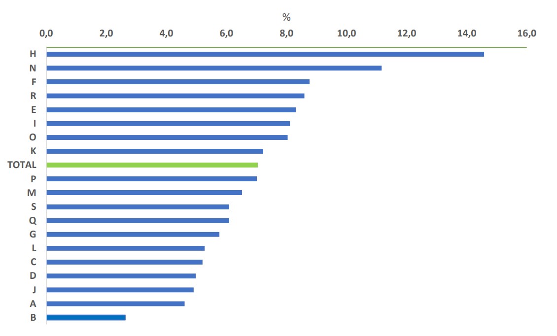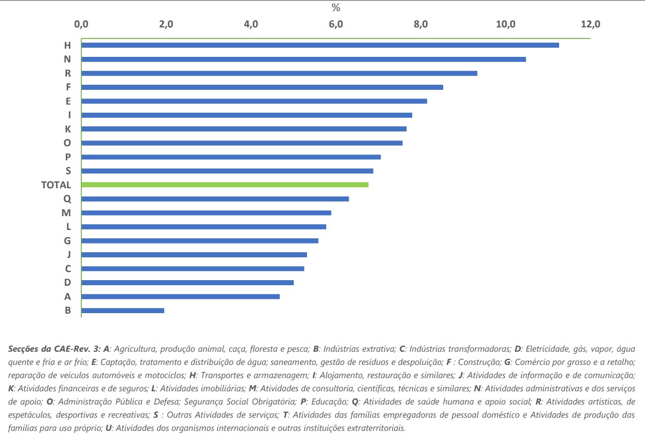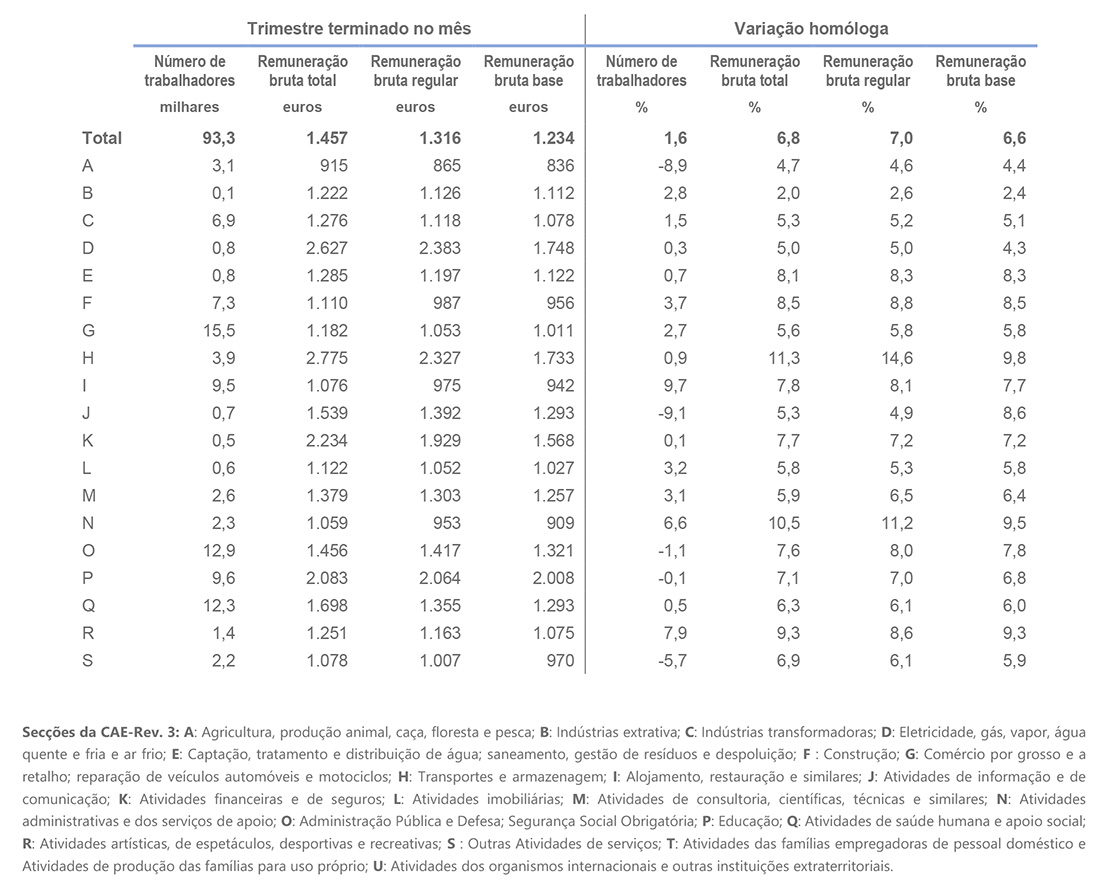 A remuneração bruta regular variou entre 865 euros na Agricultura, produção animal, caça, floresta e pesca e 2.383 euros nas atividades de Eletricidade, gás, vapor, água quente e fria e ar frio, variando homologamente +4,6% e +5,0%, respetivamente (Figura 6 e Quadro 2).