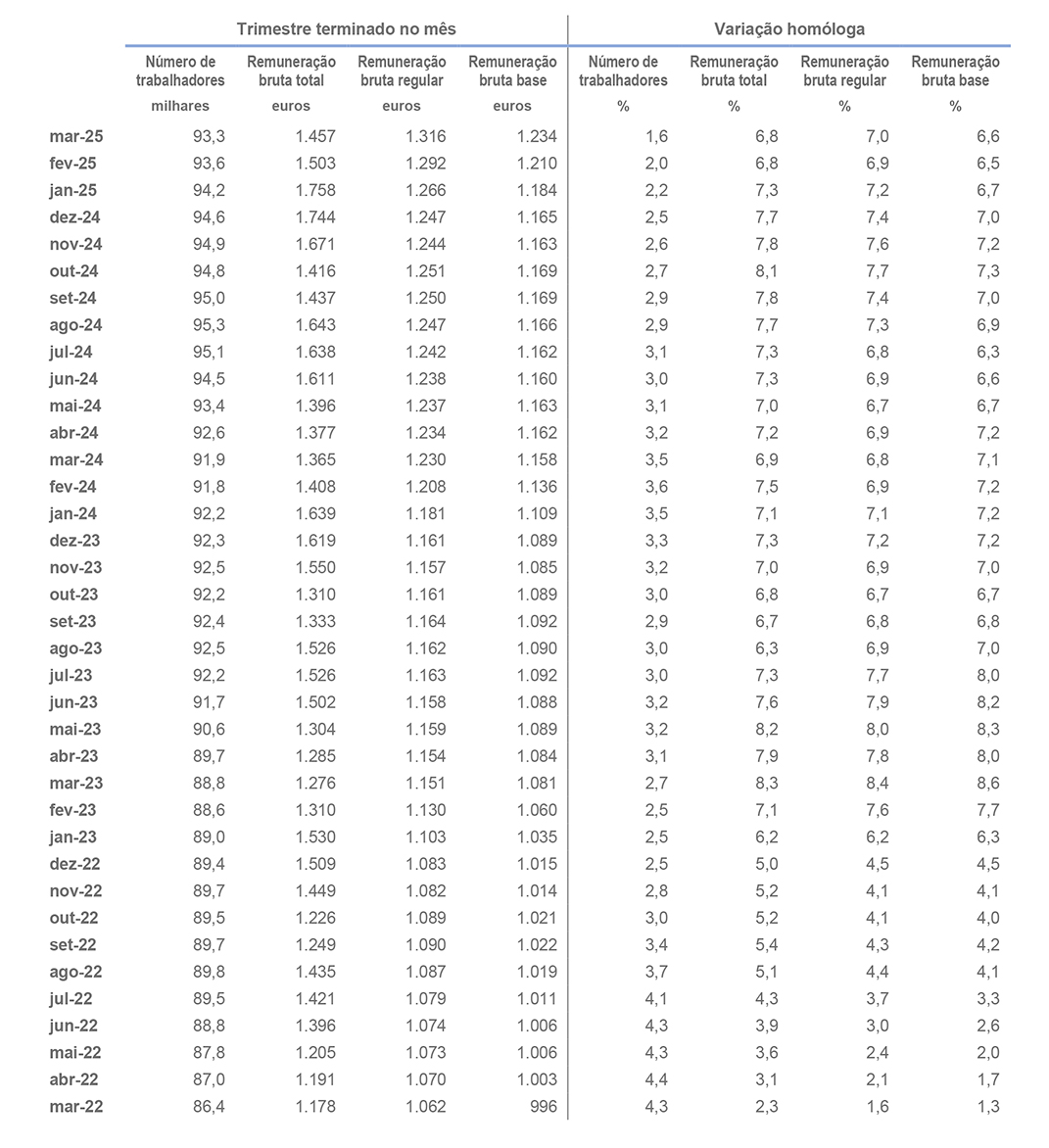Em março de 2025, a remuneração bruta total mensal média por trabalhador aumentou 6,8%, passando de 1.365 euros em março de 2024, para 1.457 euros um ano depois (Figura 1 e Quadro 1).