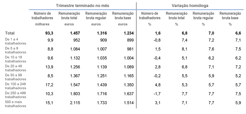 Em março de 2025, a remuneração bruta total variou entre 952 euros nas entidades com 1 a 4 trabalhadores e 2.115 euros nas empresas com 500 e mais trabalhadores (Figura 8 e Quadro 3); a maior variação homóloga verificou-se nas entidades com 5 a 9 trabalhadores (+8,1%).