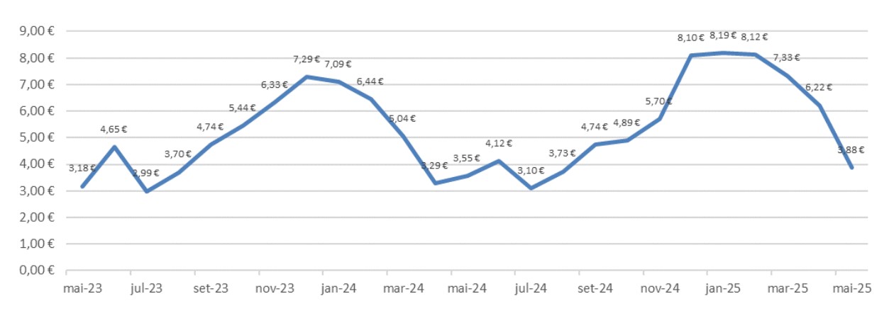 Quanto ao preço médio, neste mês aumentou 9,2% face ao mesmo mês do ano passado, para 3,88 €/kg, diminuiu 37,6% em relação ao mês anterior e aumentou 12,5% na média dos últimos 12 meses.