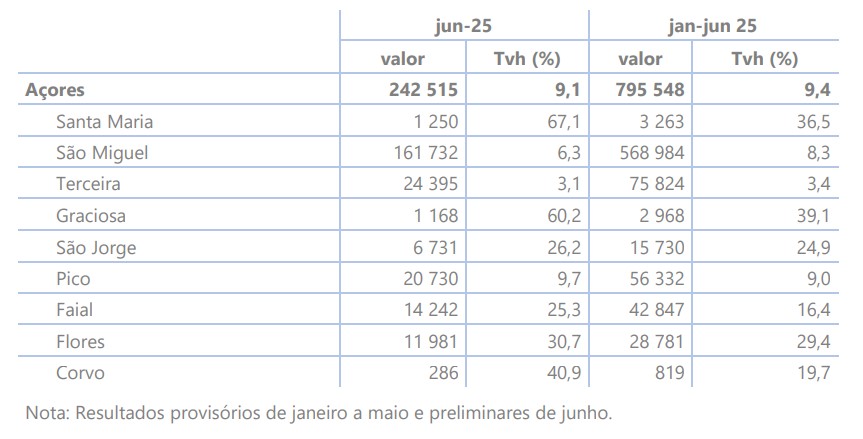 Para estes dois tipos de estabelecimentos de alojamento turístico, em junho, todas as ilhas apresentaram variação homóloga positiva nas dormidas, exceto a ilha Terceira (-1,8%): Santa Maria (25,7%), Graciosa (25,6%), Corvo (20,2%), São Jorge (15,8%), Flores (13,8%), Faial (10,4%), Pico (6,9%) e São Miguel (1,4%).