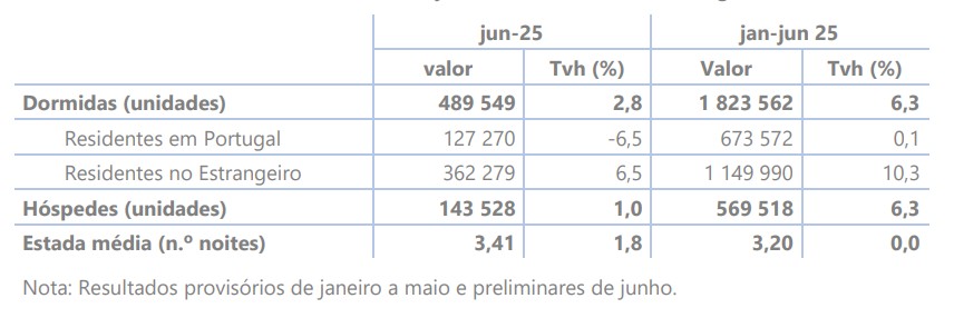 No primeiro semestre de 2025, o total de dormidas atingiu 1,9 milhões, representando um acréscimo face ao período homólogo de 7,0%. Relativamente aos hóspedes, o número total foi 595,8 milhares, valor superior em 6,9% relativamente ao período homólogo. Neste período, a estada média situou-se nas 3,20 noites, apresentando o mesmo valor do primeiro semestre do ano anterior.