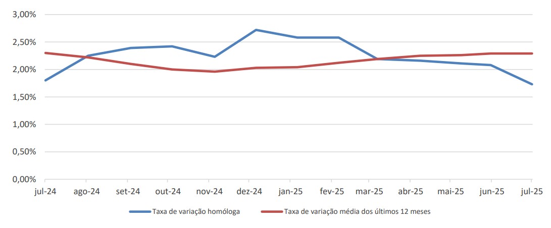 A taxa de variação média dos últimos doze meses, terminados em julho, do Índice de Preços no Consumidor, “Total”, manteve-se nos 2,29%. As maiores variações médias positivas verificaram-se nas classes “Restaurantes e hotéis” (6,30%), “Habitação, água, eletricidade, gás e outros combustíveis” (4,56%), “Saúde” (4,25%) e “Bebidas alcoólicas e tabaco” (3,06%). Em sentido contrário, a classe que apresentou variação média negativa foi a do “Vestuário e calçado” (-2,06%).