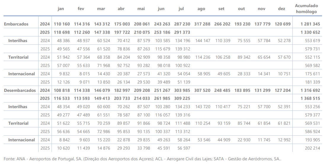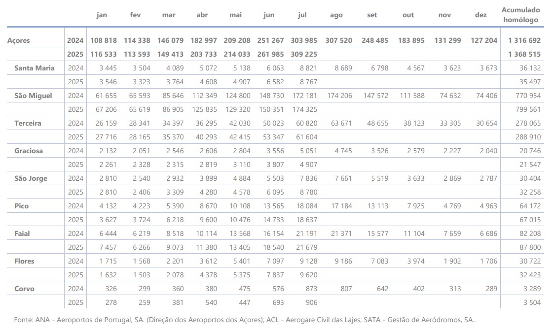 No mês de julho de 2025 desembarcaram 309 225 passageiros nos aeroportos dos Açores, verificando-se um acréscimo homólogo de 1,7%. Nos voos interilhas desembarcaram 139 316 passageiros (acréscimo homólogo de 3,8%), nos voos territoriais 113 312 passageiros (acréscimo homólogo de 1,6%) e nos voos internacionais 56 597 passageiros (decréscimo homólogo de 2,9%).