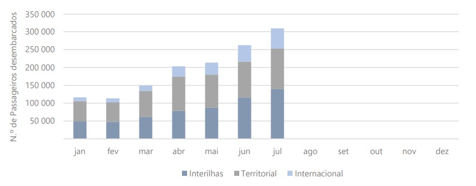 Nos aeroportos dos Açores, em julho, os passageiros desembarcados verificaram-se com maior intensidade em voos interilhas (45,1% do total de passageiros desembarcados), seguindo-se os desembarcados em voos territoriais (36,6%) e os desembarcados em voos internacionais (18,3%).