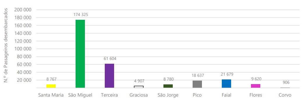 Neste mês, a ilha de São Miguel, com 174 325 passageiros desembarcados, concentrou 56,4% do total de passageiros desembarcados nos aeroportos dos Açores, seguindo-se as ilhas Terceira, com 61 604 passageiros desembarcados (19,9% do total), Faial, com 21 679 passageiros desembarcados (7,0% do total), e Pico, com 18 637 passageiros desembarcados (6,0% do total).