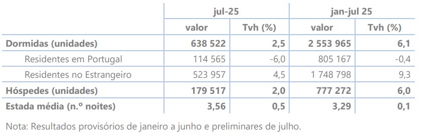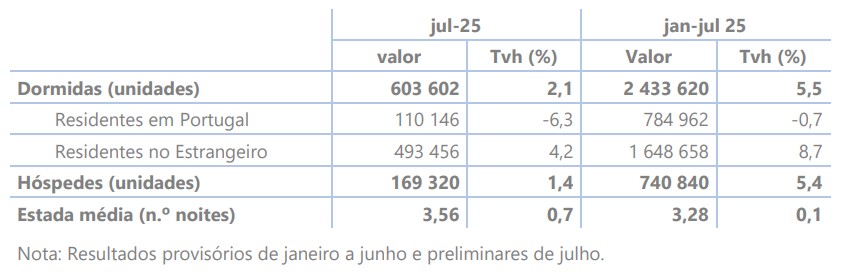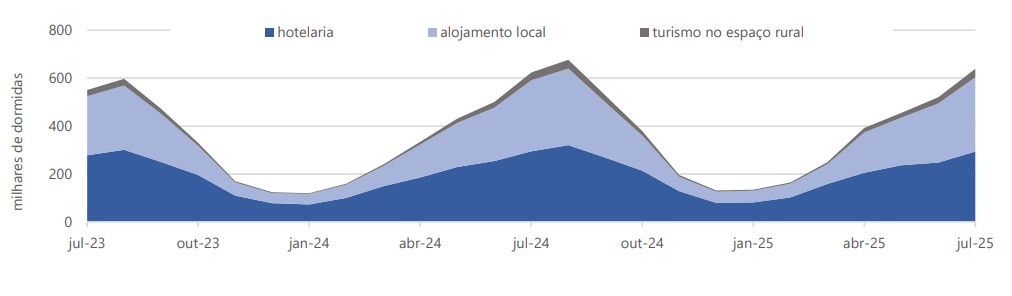 Considerando apenas os dois tipos mais representativos de estabelecimentos de alojamento turístico, hotelaria e alojamento local, com 94,5% do total de dormidas no mês de julho, registaram-se 603,6 mil dormidas, com uma variação homóloga positiva de 2,1%.