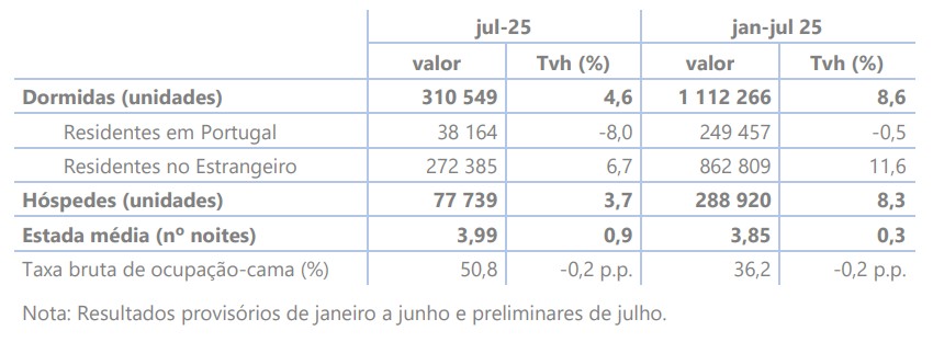 No período acumulado de janeiro a julho, no alojamento local, registaram-se 1,1 milhões de dormidas, valor superior em 8,6% ao registado no mesmo período homólogo.