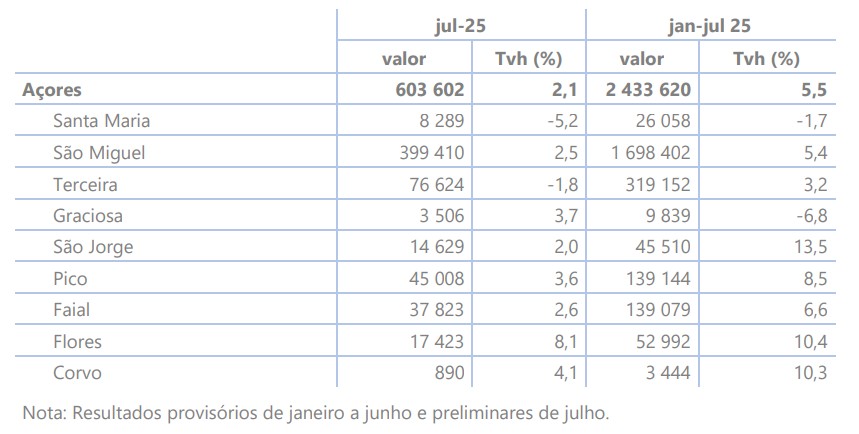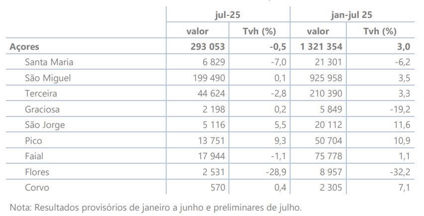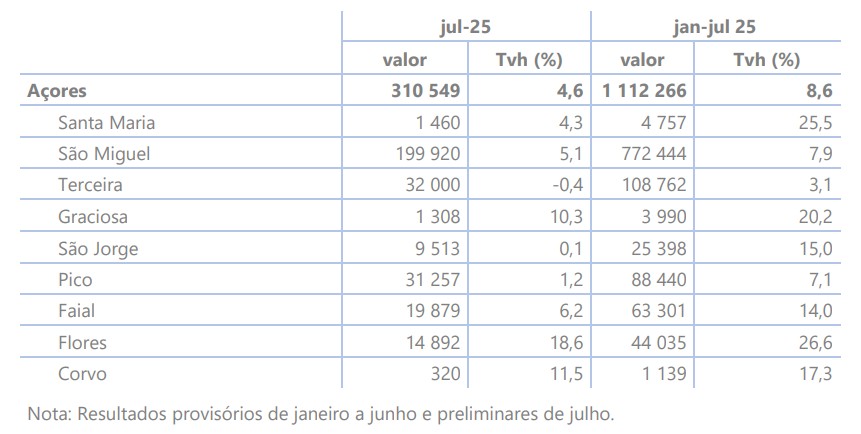 Para estes dois tipos de estabelecimentos de alojamento turístico, em julho, as ilhas que apresentaram variação homóloga positiva nas dormidas foram: Flores (8,1%), Corvo (4,1%), Graciosa (3,7%), Pico (3,6%), Faial (2,6%), São Miguel (2,5%) e São Jorge (2,0%). Em sentido inverso, as ilhas Santa Maria (-5,2%) e Terceira (-1,8%) apresentaram variação homóloga negativa nas dormidas.