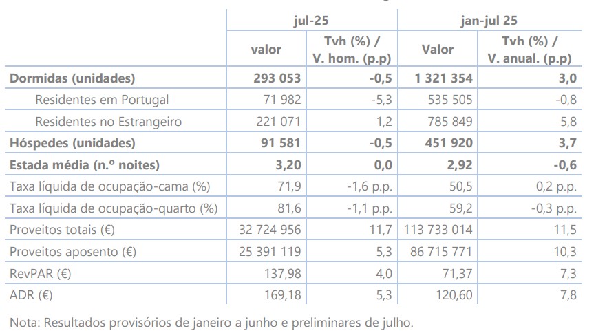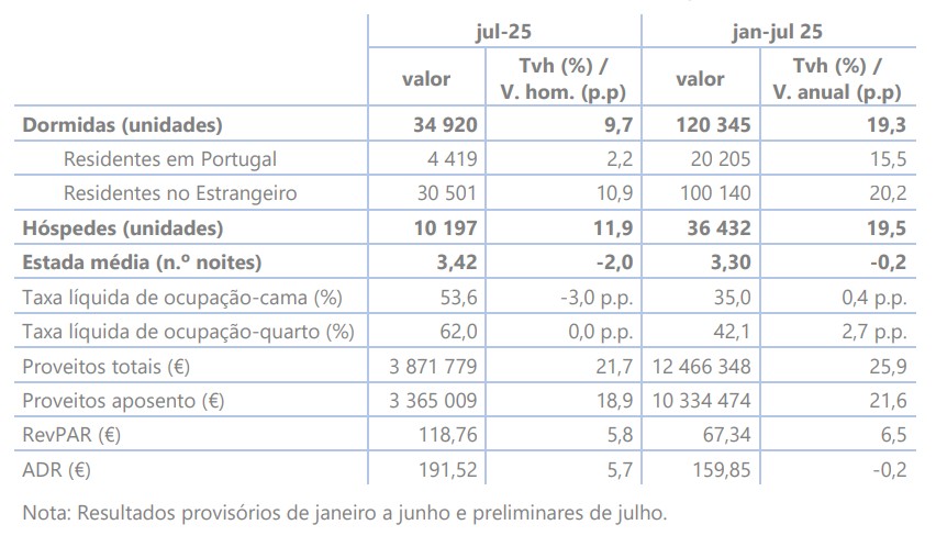 Os proveitos totais, no mês de julho, registaram uma variação homóloga positiva de 11,7%, atingindo 32,7 milhões de euros, e os proveitos de aposento tiveram uma variação positiva de 5,3%, relativamente ao mesmo mês do ano anterior, totalizando 25,4 milhões de euros. O rendimento médio por quarto disponível (RevPAR) foi de 137,98 euros e por quarto utilizado (ADR) foi de 169,18 euros.