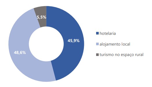 Considerando o conjunto dos estabelecimentos de alojamento turístico, o alojamento local concentrou 48,6% da totalidade de dormidas (310,5 mil dormidas), seguindo-se a hotelaria com 45,9% (293,1 mil dormidas) e o turismo no espaço rural com 5,5% (34,9 mil dormidas).