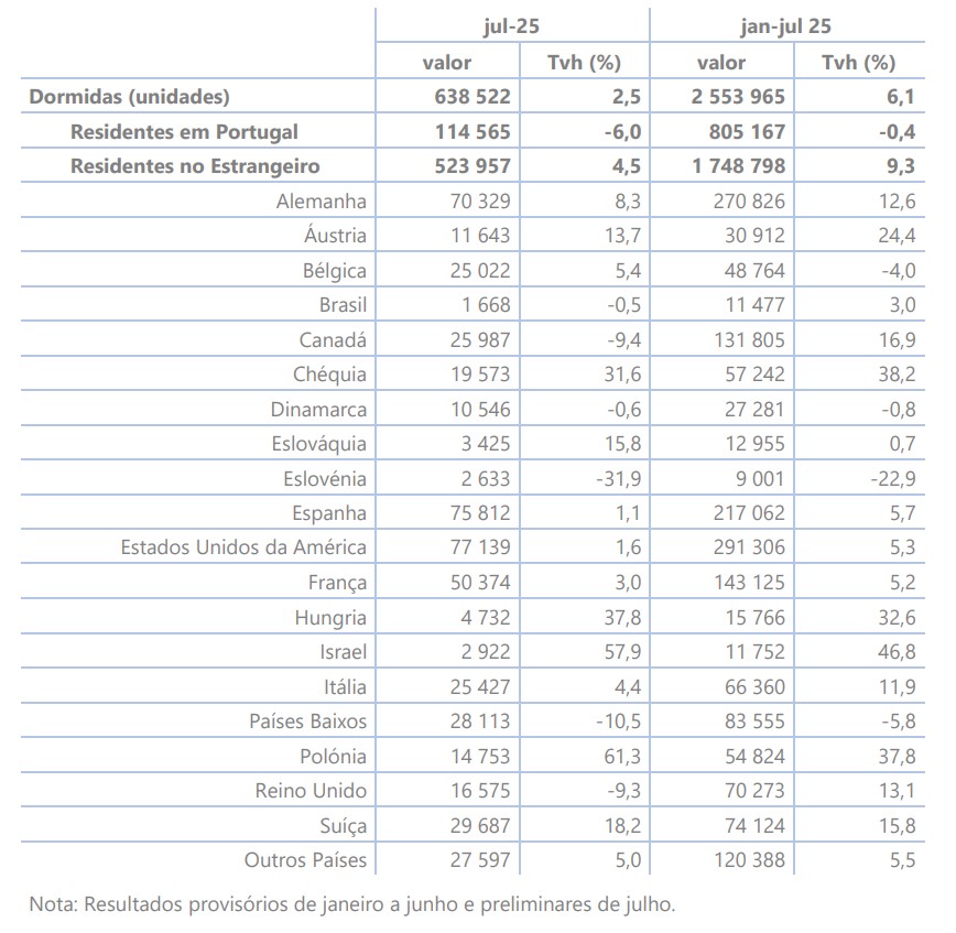 No país, em julho, as dormidas apresentaram uma variação homóloga positiva de 3,5%.