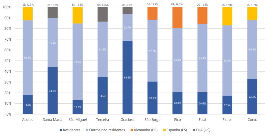 Analisando as dormidas, por mercados, na hotelaria e alojamento local, para os Açores, o mercado nacional (residentes em Portugal) garantiu 18,2% do total, enquanto os mercados externos (residentes no estrangeiro) contribuíram com 81,8%. O mercado nacional destacou-se, com maior peso nas dormidas, na ilha Graciosa (68,8%). Analisando os principais mercados externos, para os dois tipos mais representativos de estabelecimentos de alojamento turístico, o mercado espanhol foi o principal mercado externo para os Açores (12,3%) e nas ilhas Flores (17,0%), São Miguel (15,2%) e Corvo (11,9%). O mercado alemão destacou-se no Pico (19,7%), Faial (15,6%) e São Jorge (11,7%). Os Estados Unidos da Améria foram o principal mercado externo na Terceira (13,6%), Santa Maria (10,2%) e Graciosa (6,5%).