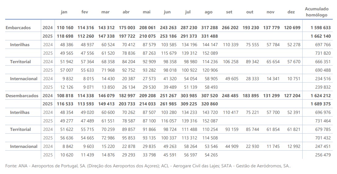 No mês de agosto de 2025 desembarcaram 320 860 passageiros nos aeroportos dos Açores, verificando-se um acréscimo homólogo de 4,3%. Nos voos interilhas desembarcaram 152 087 passageiros (acréscimo homólogo de 5,8%), nos voos territoriais 114 508 passageiros (acréscimo homólogo de 3,9%) e nos voos internacionais 54 265 passageiros (acréscimo homólogo de 1,3%).