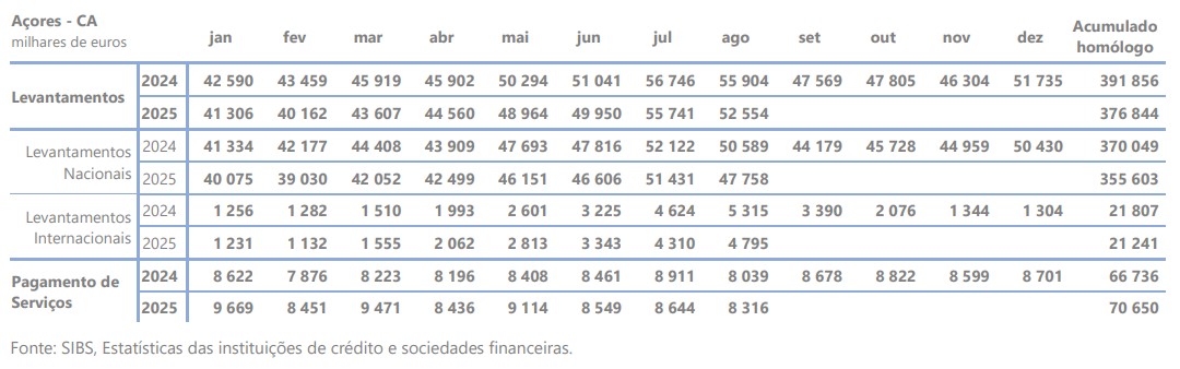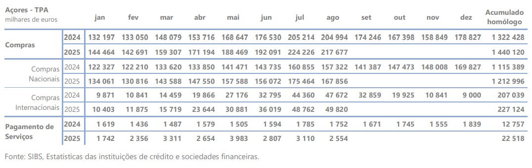 As compras realizadas por intermédio de cartões bancários em TPA atingiram em agosto de 2025, nos Açores, o montante de 217,7 milhões de euros, a que corresponde um acréscimo homólogo de 6,2%.
