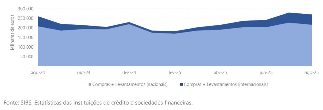 Destes, cerca de 167,9 milhões de euros foram de compras efetuadas com cartões de bancos nacionais, o que representa uma variação homóloga positiva de 6,7%, e cerca de 49,8 milhões de euros dizem respeito a compras efetuadas com cartões de bancos internacionais, o que traduz um aumento homólogo de 4,5%.