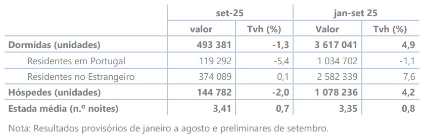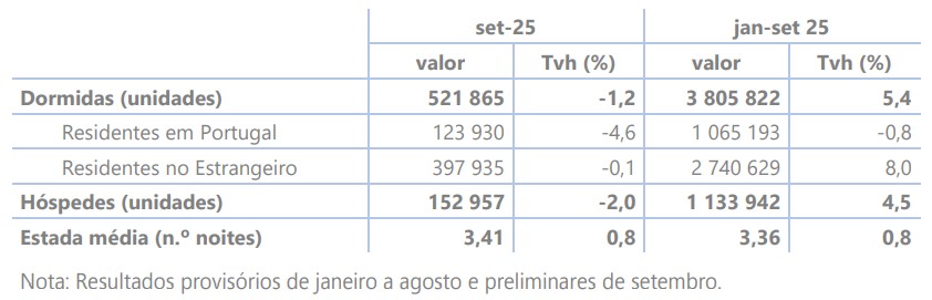 Considerando apenas os dois tipos mais representativos de estabelecimentos de alojamento turístico, hotelaria e alojamento local, com 94,5% do total de dormidas no mês de setembro, registaram-se 493,4 mil dormidas, com uma variação homóloga negativa de 1,3%.