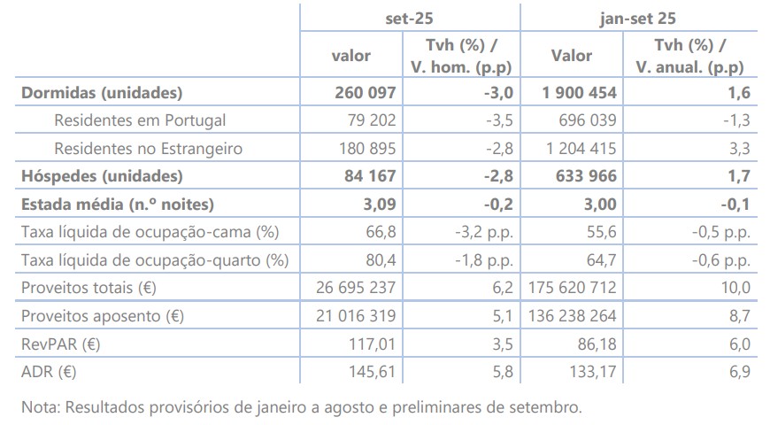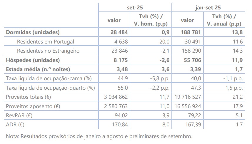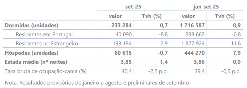 No período acumulado de janeiro a setembro, na hotelaria, registaram-se 1,9 milhões de dormidas, valor superior em 1,6% ao registado no mesmo período homólogo