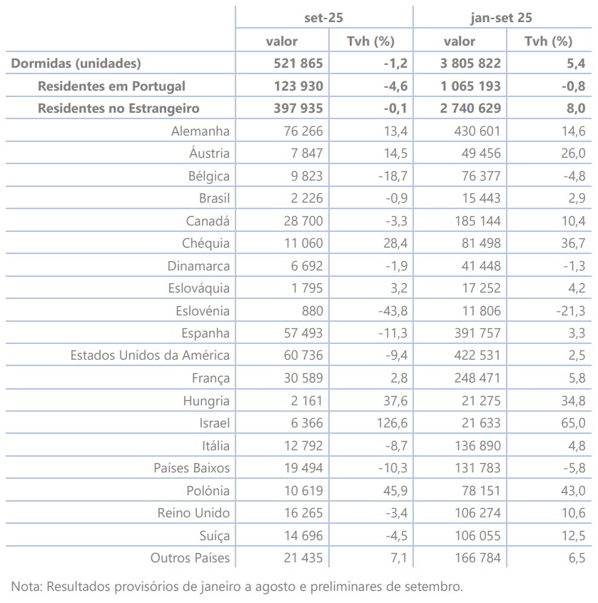 No país, em setembro, as dormidas apresentaram uma variação homóloga positiva de 0,7%.