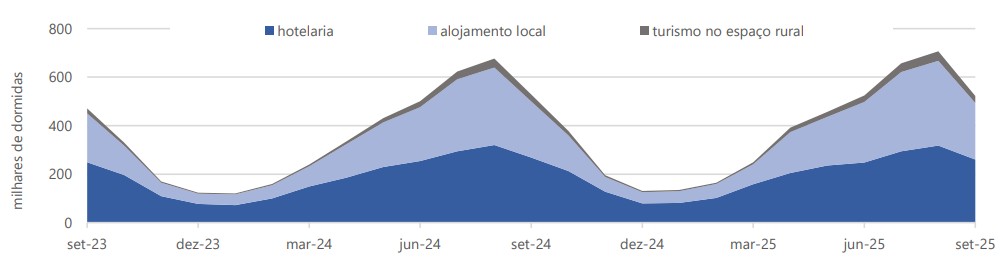 Entre setembro de 2023 e setembro de 2025, no conjunto dos estabelecimentos de alojamento turístico, o registo mais elevado de dormidas, nos Açores, ocorreu em agosto de 2025, com 706,6 mil dormidas.