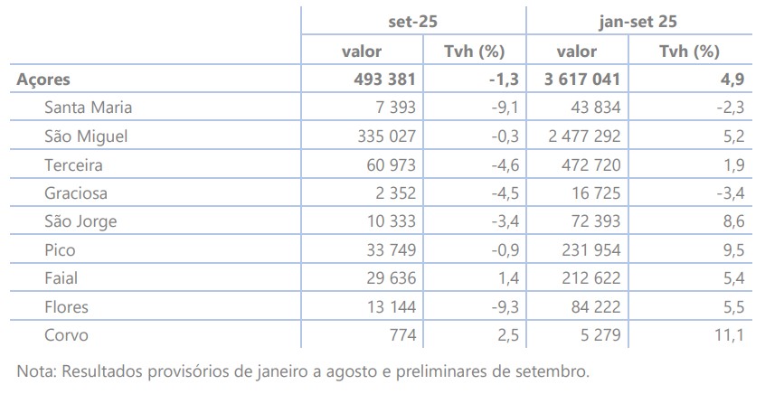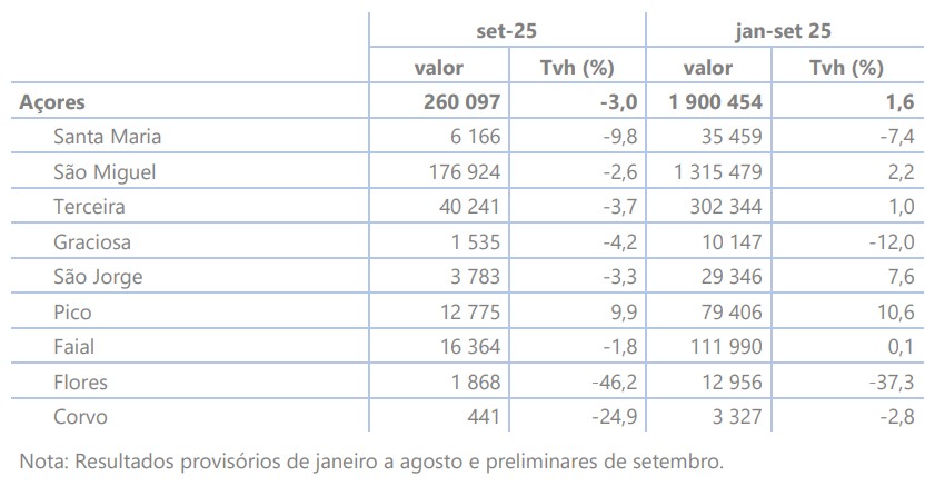 Na hotelaria, em setembro, apenas a ilha do Pico (9,9%) apresentou variação homóloga positiva nas dormidas. Em sentido inverso, as ilhas Flores (-46,2%), Corvo (-24,9%), Santa Maria (-9,8%), Graciosa (-4,2%), Terceira (-3,7%), São Jorge (-3,3%), São Miguel (-2,6%) e Faial (-1,8%) apresentaram variação homóloga negativa nas dormidas.