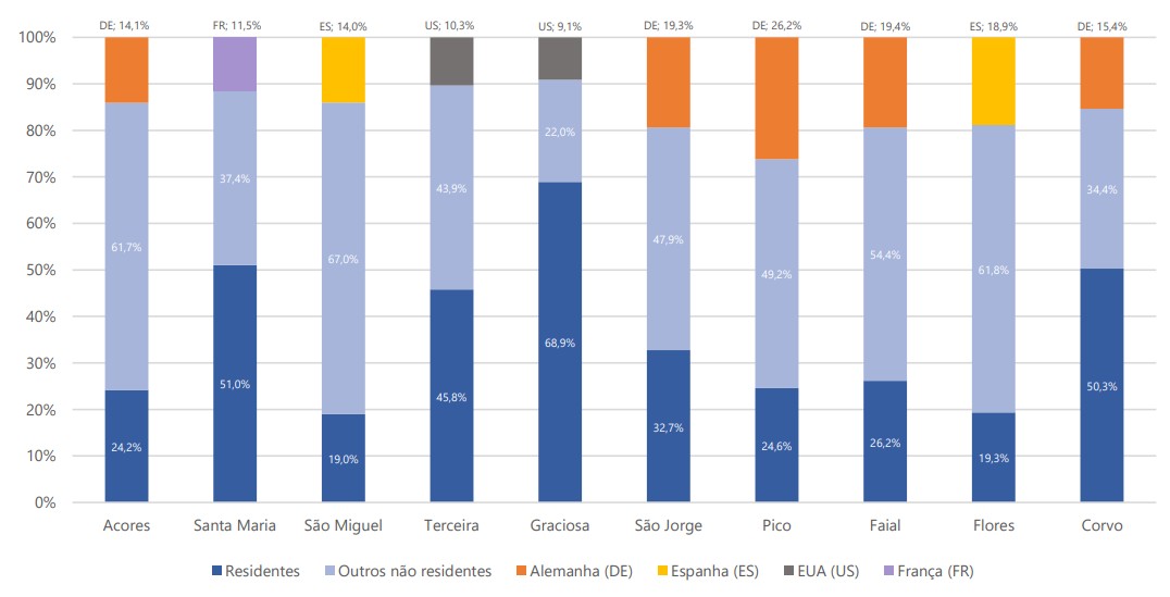 Analisando as dormidas, por mercados, na hotelaria e alojamento local, para os Açores, o mercado nacional (residentes em Portugal) garantiu 24,2% do total, enquanto os mercados externos (residentes no estrangeiro) contribuíram com 75,8%. O mercado nacional destacou-se, com maior peso nas dormidas, nas ilhas Graciosa (68,9%), Santa Maria (51,0%) e Corvo (50,3%). Analisando os principais mercados externos, o mercado alemão foi o principal mercado externo para os Açores (14,1%) e nas ilhas Pico (26,2%), Faial (19,4%), São Jorge (19,3%) e Corvo (15,4%). O mercado espanhol foi o principal mercado externo nas ilhas Flores (18,9%) e São Miguel (14,0%) e o mercado dos Estados Unidos da América nas ilhas Terceira (10,3%) e Graciosa (9,1%). Em Santa Maria, a França foi o principal mercado externo (11,5%).