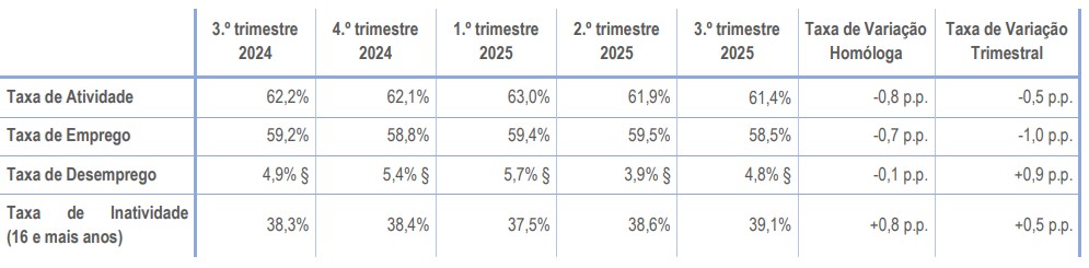 - Destaque Estatísticas do Emprego – 3.º trimestre de 2025 do Instituto Nacional de Estatística, I.P. (INE), onde são apresentados os valores nacionais e das restantes regiões NUTS II.