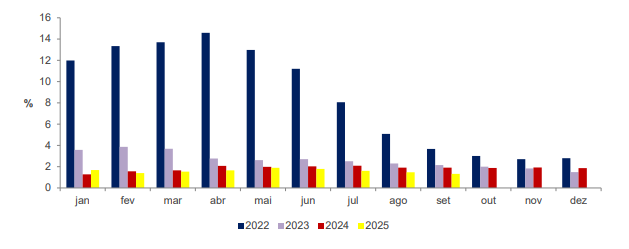 Figura 2 – IAE-Açores: 2022 – 2025 (taxa de variação homóloga, em %; média móvel de 3 meses)