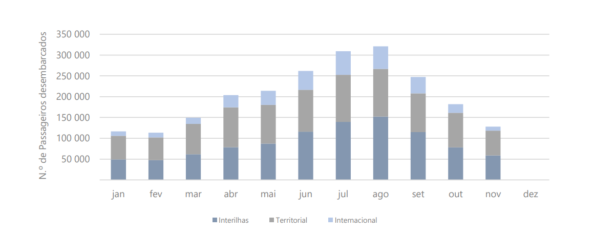 No mês de novembro de 2025 desembarcaram 128 073 passageiros nos aeroportos dos Açores, verificando-se um decréscimo homólogo de 2,5%. Nos voos territoriais desembarcaram 59 398 passageiros (decréscimo homólogo de 4,0%), nos voos interilhas 58 899 passageiros (acréscimo homólogo de 2,1%) e nos voos internacionais 9 776 passageiros (decréscimo homólogo de 16,8%).